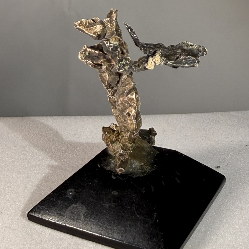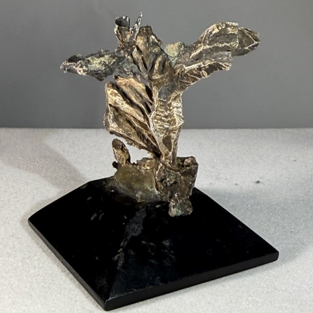 Nydelig Sølvstuff fra Kongsberg. Usikker hvilken av gruvene. Dette kan ikke sammenlignes med trådsølv. Disse er mye mer uvanelige. Denne er fra en meget gammel samling. Fra en kjent Norsk samler. Den står på svart lakkert trebase. Den veier 30 gram med basen. Sølvet er 3,5 cm høyt 3,5 cm bredt på det høyeste og bredeste.