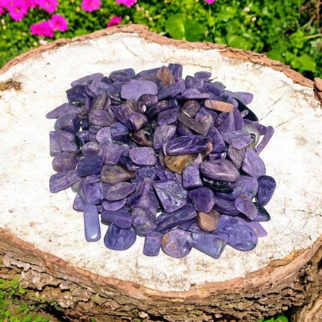 Bra farge, og topp kvalitet! Selges i poser på 100 gram. Gir indre ro, drømmebevisthet og meditasjon. Bra ved smerter og kroniske lidelser. Aktiviserer immunforsvaret. Charoit fra området ved Chary elven i Russland. Dette er topp kvalitet tromlet chips.