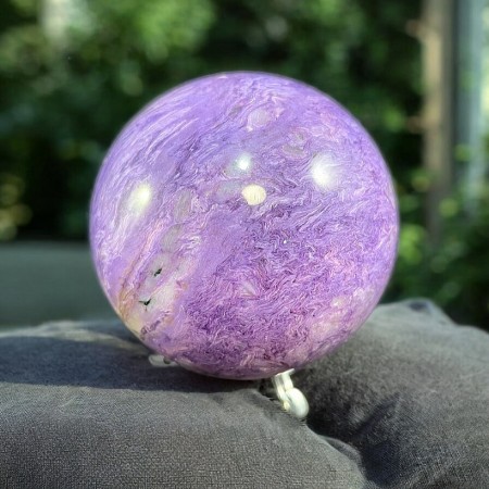 Charoit kule med meget sterk farge. Denne kulen veier 850 gram og er ca 8,5 cm i diameter. Leveres med holder.