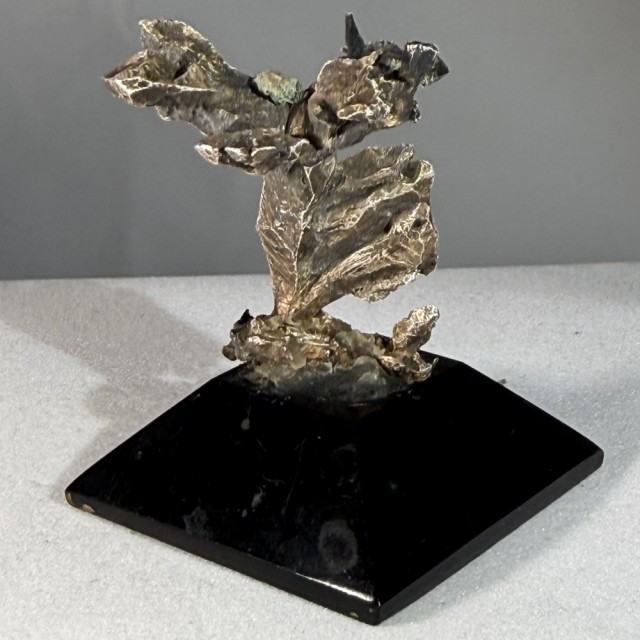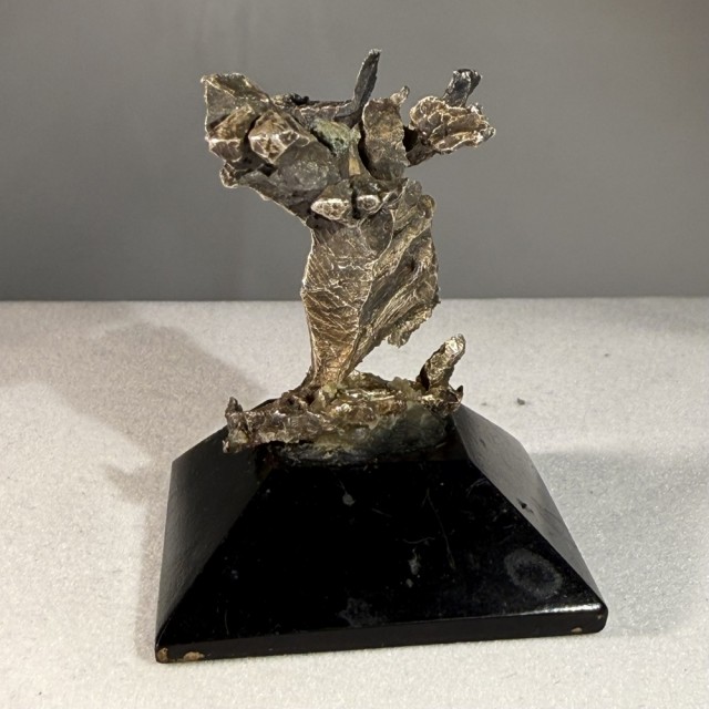 Nydelig sølvstuff. Dette er antagelig det som kalles krystalisert sølv. Kan ikke sammenlignes med trådsølv. Denne er fra en gammel samling. Den står på en svar lakkert trebase. Den veier 30 gram med basen. Sølvet er 3,5 cm høyt.